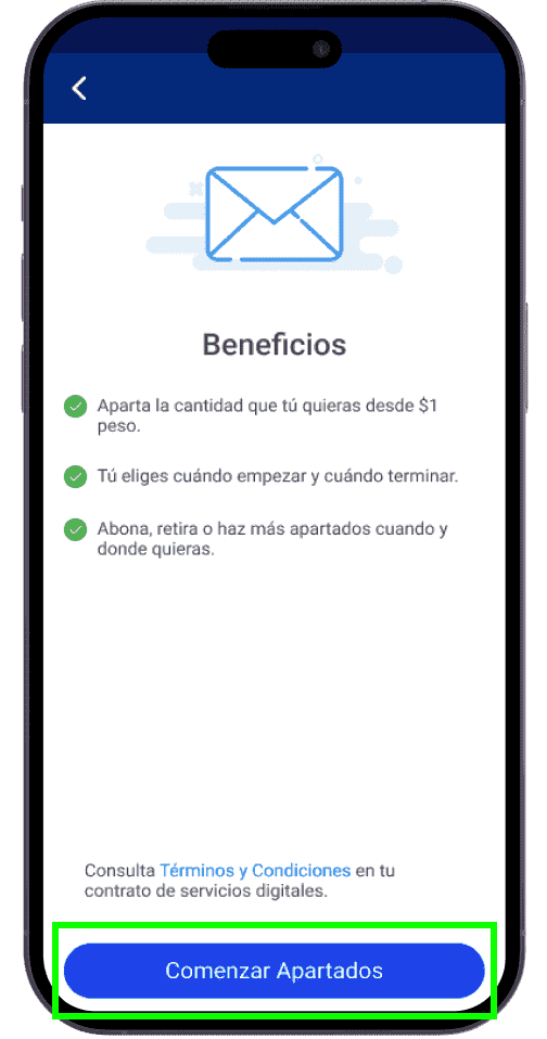 Consulta beneficios y los Términos y Condiciones. Después, presiona Comenzar Apartados