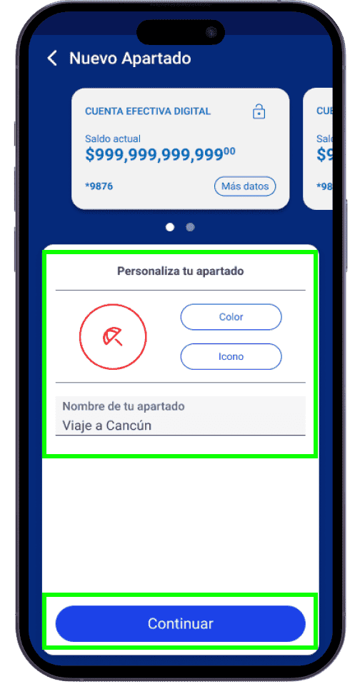 Selecciona la cuenta y personaliza tu Apartado con un color, ícono y nombre. Luego, presiona Continuar