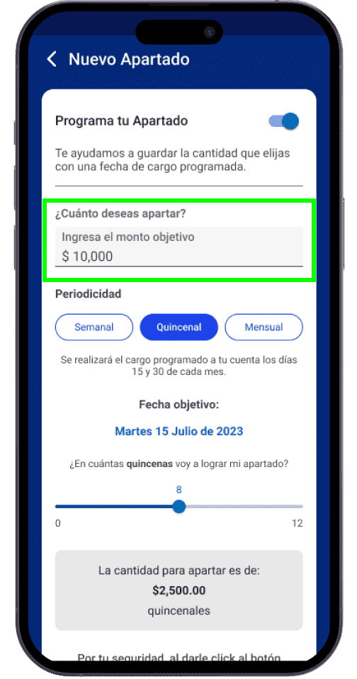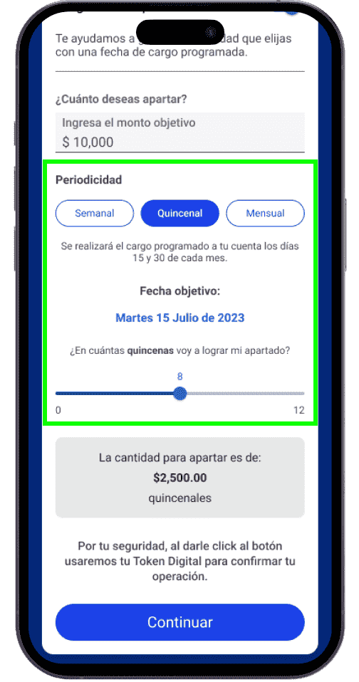 Elige la periodicidad de tu Apartado y en cuánto tiempo quieres lograr tu meta. Pulsa Continuar