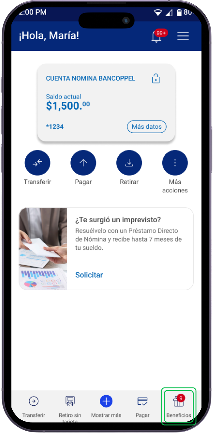 Ingresa a tu App BanCoppel y presiona Beneficios en el menú inferior