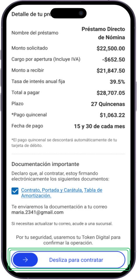 Revisa y acepta los documentos, luego desliza para contratar
